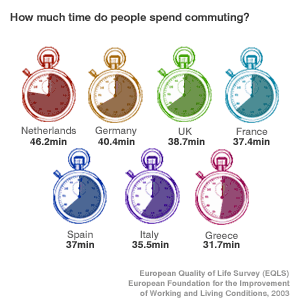 ![]() | Gridlock? Dutch and German workers spend more time on average commuting than British workers. However, UK managers have the longest commute in the EU at 53.4 mins on average a day, well above the EU average of 44.3mins. Similarly, UK parents have the longest commutes at 51.9 mins, far higher than the EU average of 36.4mins. |
