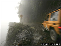 Every year it is estimated 200 to 300 people die on a stretch of road less than 50 miles long. In one year alone, 25 vehicles plunged off the road and into the ravine. That is one every two weeks. It is the end of the dry season in Bolivia. Soon the rains will come - cascading down the walls of the chasm. Huge waterfalls will drench the road - turning its surface to slime.