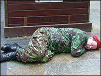 An artist is lying down in a busy street dressed as soldier for one week to highlight the subject of conflict. The piece, called Dead Solider, will see Mark McGowan, 38, lie curled up on Birmingham's New Street for 10 hours each day, from 14 - 20 November.