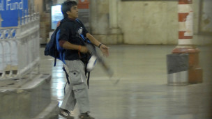 وصورت احدى الكاميرات في المحطة الرئيسية للقطارات في مومباي قصاب وهو يسير داخل المحطة حاملا بندقية وحقيبة على ظهره.