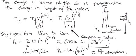 This is what's going on with Yan's fire piston. Once he's reduced the tube's volume to about a tenth of its previous size it increases the air temperature to well above that in an oven, and more importantly well above the ignition point of the cotton wool he's got in there.