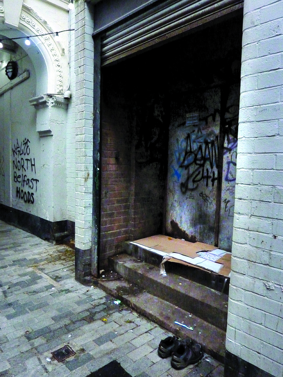 This photo was taken recently in Belfast. It's off one of the main streets in the city centre, away from the twinkling Christmas lights. At first you see the dirt, the graffiti on the walls, the cardboard. Then the neatly placed shoes, and then the toothbrush. This is someone's home. Or at least where they sleep at night. Their patch in the heart of the city centre. According to local homeless figures it is estimated that 30-40 people are sleeping rough in Belfast at any given time. The shoes break my heart, placed the way most of us place our slippers under the bed. Word has it that the street cleaners always put this person's shoes & toothbrush back in place. That's dignity.