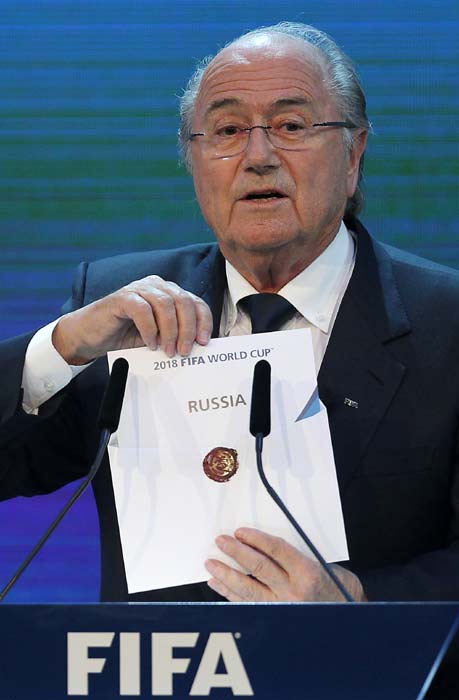 Ac yn ddisymwth yr oedd gyda Blatter liaws o lu FIFA, yn moliannu Rwsia, ac yn dywedyd, "Gogoniant yn y goruchaf i FIFA, ac ar y ddaear cyfiawnder, i ddynion ewyllys da".