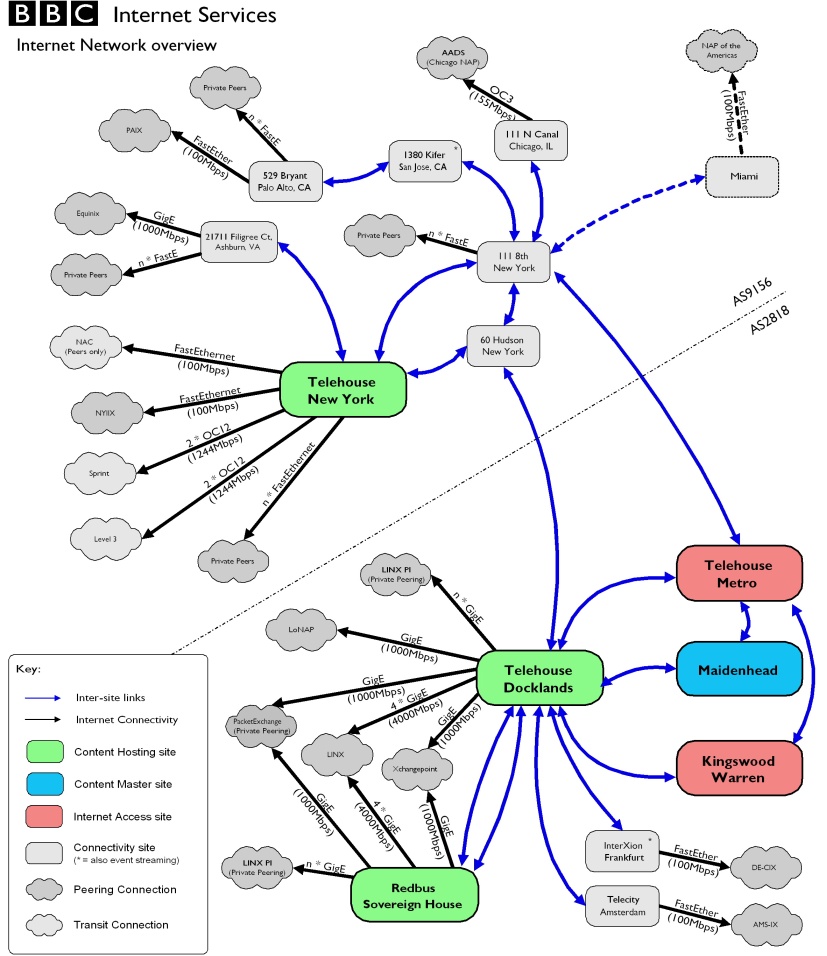 News was having performance problems with its outsourced servers, including ISPs having trouble reaching them. News's own ISP didn't have an open peering policy, leading to questions from others as to why they should pay to get to the News site when they peered with us on the main site for free. This came to a head in November; our offer was to add News hosting to the New York server farm, relieving their servers of non-UK traffic. This helped, and as their ISP was pulling out of the hosting market, News set up a set on the BBC network in the UK too. This worked well with the huge growth.