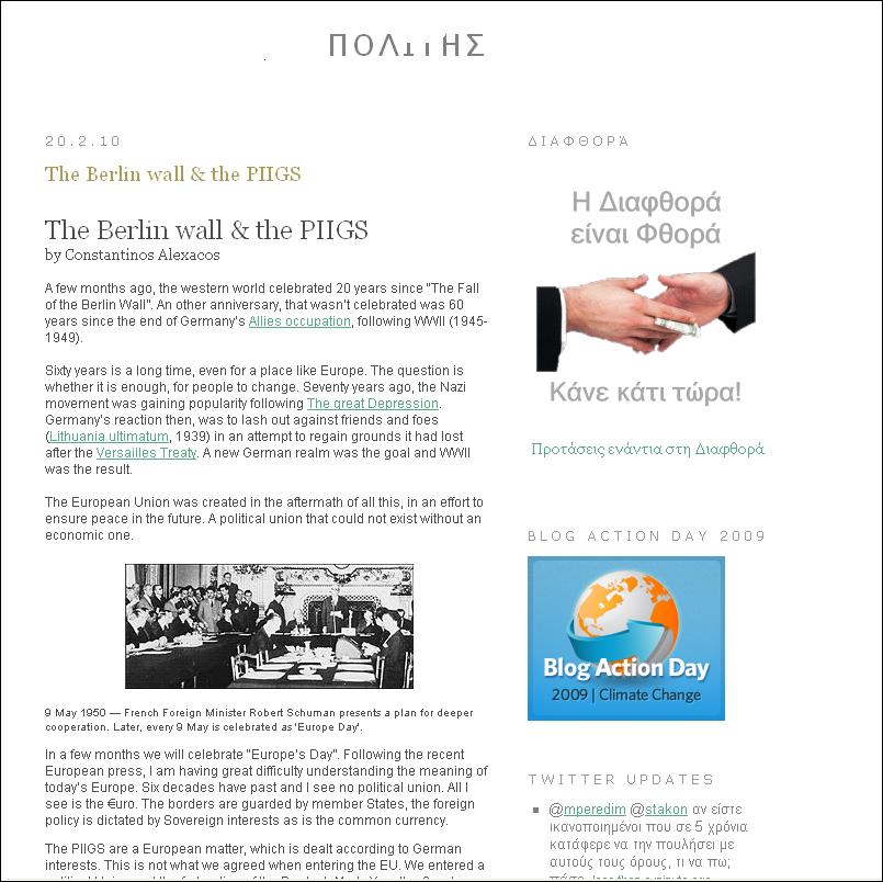 He then blogged to try and free a person who was jailed, without trial, for nine months during the 2008 riots. And as you can see from the post below , Constantinos looks at the economic woes of Greece and how according to him the EU is also to blame for the situation..