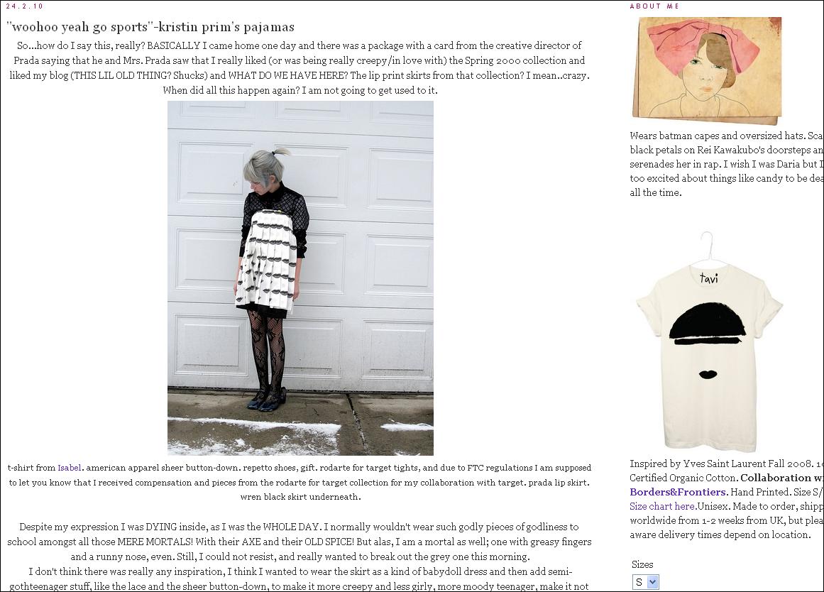 In the post below, Tavi talks about how she came home from school one day and found that the creative director of Prada along with Mrs. Prada had sent her a skirt from the Spring 2000 collection (when Tavi was just three!) because they noticed from her blog that she loved it so much.