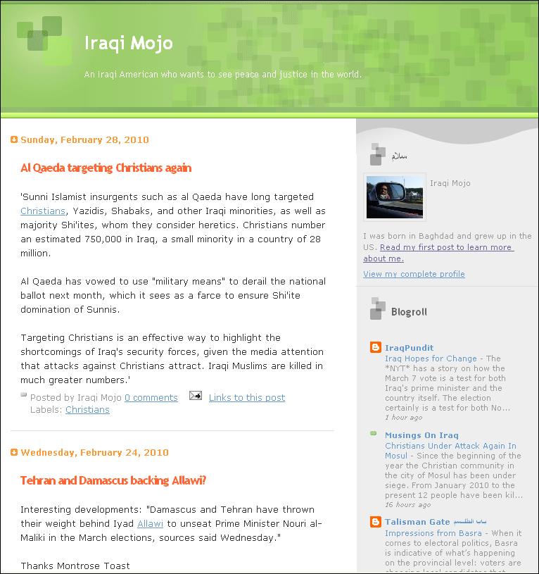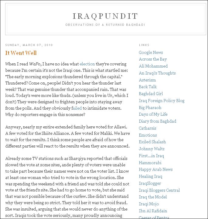Look out for more on Iraqi Mojo and other Iraqi bloggers, we're getting more views from the Iraqi blogosphere on this weeks parliamentary elections.