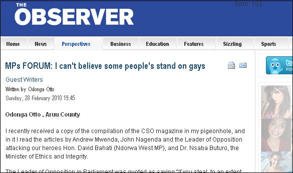 UK-based Nigerian blogger Sokari Ekine on blacklooks.org talks about Uganda's homosexuality bill. Her post links to a piece in the Uganda Observer by Ugandan MP and supporter of the bill Odonga Otto: