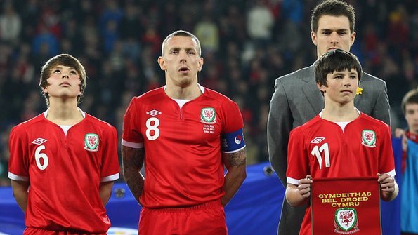 Gary Speed's sons Thomas and Edward pay their respects alongside Craig Bellamy and Aaron Ramsay before kick-off. Photo: Getty