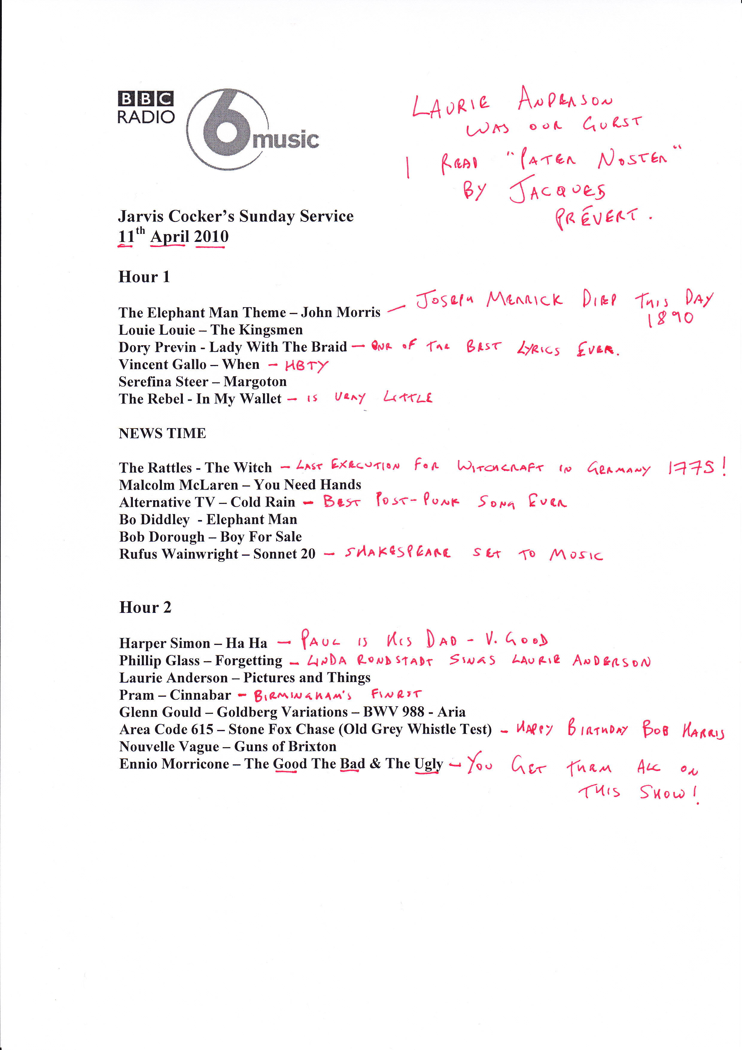 Here is the set list from this Sunday's programme. I was joined in the studio by Laurie Anderson who read a wonderful story that you will be able to listen to here on the blog very soon.