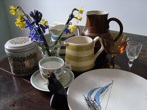 I collect charity shop china and glassware. Here's a selection of my best bits. The black bird you can see is what's known as a 'pie bird' - you put this into the middle of a dish, and build the pie around it. It lets steam out, and keeps your pastry crisp by holding it above the filling.