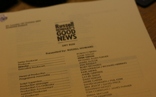 It's been a busy week for the Russell Howards Good News team. We recorded our first run-through of the show in the studio with a live audience where Russell got a chance to try out all the gags and sketches he and the team have been working on. The show went really well and everybody is buzzing, we're now getting everything ready for next week's first show! *Cough* BBC Three 10:30 Thursday night *Cough*.