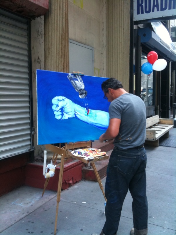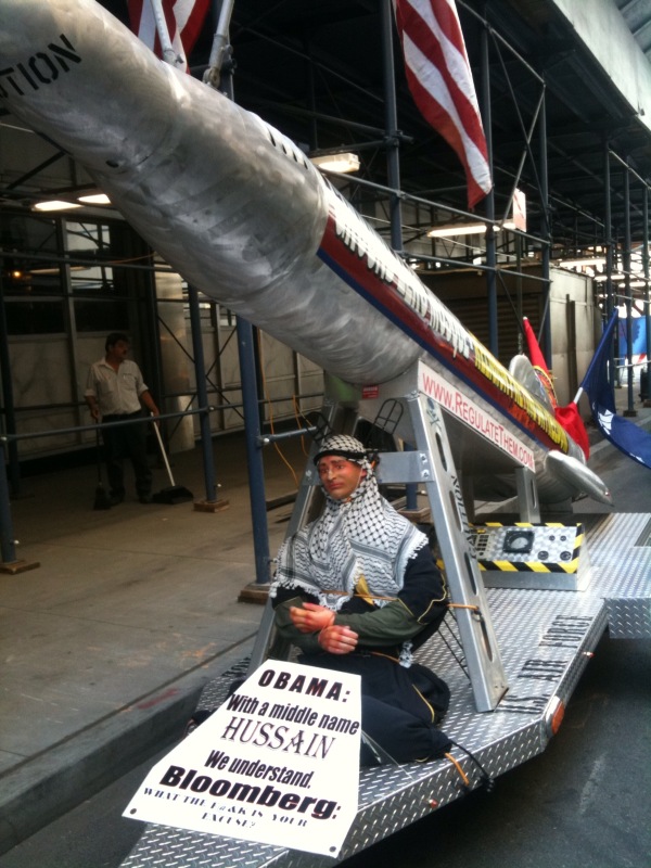 Mark, Alex and I plotted out a route around Ground Zero that Ros may take tomorrow during the show. Park51, the site of the proposed mosque was deserted yesterday, today there an artist, his photo is above, posters with historical quotes and even a car with a makeshift rocket rallying either for or against the mosque. (Click on 'read rest of entry' to see it)