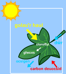 - Defnyddir egni'r haul a amsugnir gan gloroffyl y celloedd palis yn ystod y broses i droi'r carbon deuocsid a'r dŵr yn glwcos ac yn ocsigen