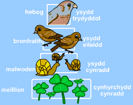 Edrychwch ar fàs yr organebau wrth symud ar hyd y gadwyn fwyd.