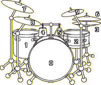 0 Drwm Bas 1 Tom Llawr 2 Drwm Tannau 3 Het Uchel 4 Cloch buwch 5 Triongl 6 Het Uchel Agored 7 Symbal Reid 8 Symbal Clec 9 Symbal Sblas