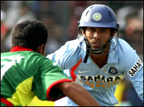 भारत को 39वें ओवर में तीसरा विकेट मिला जब जावेद उमर दुर्भाग्यपूर्ण तरीक़े से रन आउट हो गए. उन्होंने 80 रन बनाए. सक़ीबुल हसन भी ज़्यादा देर नहीं टिक पाए लेकिन इस बीच उन्होंने अपना अर्धशतक ज़रूर पूरा कर लिया. ओवर कम बचे हुए थे. इसलिए मोहम्मद अशरफ़ुल ने आक्रमक पारी खेली और 29 रन बनाए. आफ़ताब अहमद ने 16 और मोहम्मद रफ़ीक ने 11 रन बनाए. निर्धारित 47 ओवर में बांग्लादेश का स्कोर रहा सात विकेट पर 250 रन. भारत की ओर से दिनेश मोंगिया ने तीन विकेट लिए, रमेश पोवार को दो और वीरेंदर सहवाग को एक विकेट मिला. |