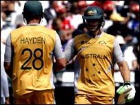 ट्वेन्टी 20 विश्व कप में ख़राब शुरुआत और पाकिस्तान के हाथों मिली हार के बावजूद विश्व चैम्पियन ऑस्ट्रेलिया ने सेमी फ़ाइनल में जगह बना ली है. एक अहम मैच में ऑस्ट्रेलिया ने श्रीलंका को 10 विकेट से हराकर ट्वेन्टी 20 विश्व कप के सेमी फ़ाइनल में जगह बना ली है. पाकिस्तान की टीम पहले ही सेमी फ़ाइनल में पहुँच चुकी है. ऑस्ट्रेलिया की टीम भले ही ज़िम्बाब्वे और पाकिस्तान के हाथों हारी लेकिन अहम मैचों में अच्छा प्रदर्शन करके ऑस्ट्रेलिया ने अपना दम दिखाया. सुपर-8 के इस अहम मैच में ऑस्ट्रेलिया ने पहले श्रीलंका की टीम को 101 रनों पर ही आउट कर दिया. फिर 102 रनों का लक्ष्य 11वें ओवर में ही बिना विकेट गँवाए हासिल कर लिया. ऑस्ट्रेलिया ने टॉस जीतकर पहले फ़ील्डिंग करने का फ़ैसला किया. श्रीलंका की शुरुआत बहुत ख़राब रही. जयसूर्या बिना कोई रन बनाए पवेलियन लौट गए तो उपुल थरंगा सिर्फ़ चार रन बनाकर आउट हो गए. पारी इसके बाद भी विकेट गिरने का सिलसिला रुका नहीं. कप्तान महेला जयवर्धने सिर्फ़ एक रन और चमारा सिल्वा छह रन ही बना पाए. जेहान मुबारक ने सर्वाधिक 28 रन बनाए. संगकारा ने 22 और चमिंडा वास ने 21 रन बनाए.