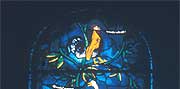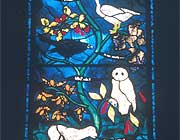 The Nativity Window at St Mary's, Iffley, Oxfordshire| Changing styles | John Piper | The themes | The making of the window | | Changing styles A less figurative approach to stained glass became apparent in the works of a designer called Alfred Wolmark: for the first time stained glass was created like an abstract painting, a mosaic of colour without iconography. Bomb damage in World War Two had destroyed many windows (though in England, Canterbury for instance, many of the ancient ones were taken out and stored) and this created opportunities for new designs and commissions. In France, eminent artists like Chagall were called upon to design windows for the great cathedrals; in England Ervin Bossanyi (from Hungary) made two impressive windows for Canterbury, and John Piper with Patrick Reyntiens created a stupendous Baptistry Window for Basil Spence’s new Coventry Cathedral.