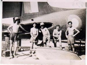 Repairs to 963 after being shot up by Japs. Ken, Jocks Hannah, McNie, Rev, Bunny
