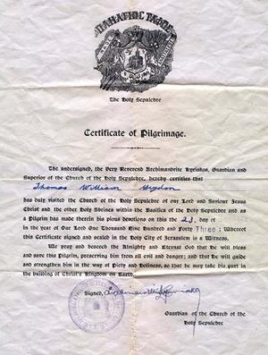 Image of a Certificate of Pilgrimage certifying that my father, Thomas William Heydon, visited The Holy Sepulchre in Jerusalem, January 23, 1943