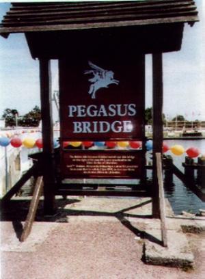 Replica 'Pegasus Bridge' sign next to the Gondrée café and Caen Canal, 23 July 2004, almost sixty years to the day after 'Operation Mosquito'. In 2004 the owner was Madame Arlette Gondrée-Pritchett, daughter of the owners in 1944.