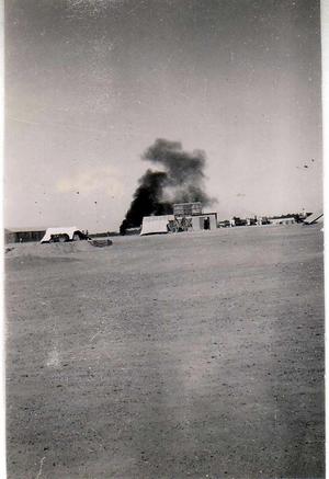 Hudson crashes into petrol dump in the act of taking off on a detachment prior to El Alemein. Photographs of the crash and the burial of the victims. Hudson crashes whilst taking off from El Khanka to go on detachment a few days previous to the start of the ‘Big Push’ of 1942. It carried a crew of eight five were killed in the kite three got out, two of them died of burns later so there was only one survivor (Paulger) a terrible tragedy.