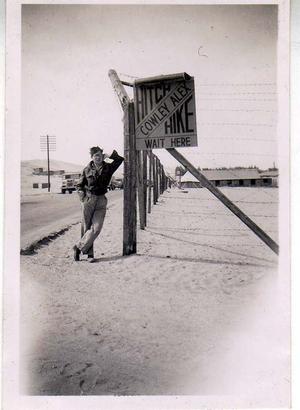 ‘Shylock’ (Sky) in a characteristic pose waiting at Cowley Camp for a lift up the road.