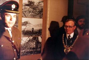 The bomb being presented to the Lord mayor of Sheffield Reg Munn at Kelham Island