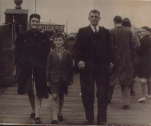 Franklin Derek Tyrer with his Mum and Dad, Sarah Jane and Harold Tyrer, taken about 1943. They are taking a stroll along Blackpool Prom on a day trip from Preston. Missing from the photograph is Franklin’s sister Maureen. [Photograph from collection of J. Ritson]