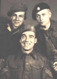 The real horrors lay ahead. The stench of blood of men and animals . Dead carcasses everywhere without human dignity stretched out along tree lined roads. Particlarly fleeing Germans caught by air attack. On the Dutch/German border at a place called Gildehaus their tank was hit. Some were killed whilst he and others escaped the stricken tank[names remembered included [Tottenham , Saxby, and Cuffe] several were killed and the survivors cowered in a roadside ditch . Capture quickly followed and a long march lasting several days Eastwards into Germany. They were 6 prisoners, now in poor condition and were handed over to the "Volksturm"? a type of dads army. Unbeknown to them their luck was about to change for the better. The journey ended in a Convent in a small German village called Thuine. The convent there had been taken over as a hospital by the German authorities. The Nuns took them in and they were placed under guard in cellar rooms. The battle front was approaching fast and there was no guarantee that they wouldn't be killed by the advancing allied troops. From the small windows at ground level in the cellars they could see an open sided German Army truck with operating table dealing with mainly German casualties, giving first aid . Busses were arriving and taking the patched up away. The nuns did their best to care for them ,taking great risk with some of the more zealous guards, to give them care and food. Despite near misses from shells the Convent survived intact and the 6 prisoners were liberated by the Coldstream Guards and filmed for the newsreel by Movitone. A friend of my father saw the newsreel "In the Wake of the Hun" in a cinema and was astonished to recognise his pal "Jimmy" alive on screen . My father had been registered as a POW and was told his war was over but hours later through a mistake he was ordered to fight again. Protesting but continuing again in another tank he was placed under open arrest . Despite his uncertainty of his situation, his case was examined and indeed he had been registered as a POW by the Red Cross. Finally , days later he was taken out of combat. Later he and the others were flown back to Belgium . The Dakota made a hard landing on a temporary steel runway and the undercarriage collapsed. Luckily no one was killed! Flying back over the channel he finally heard that the European war was over. He had survived.