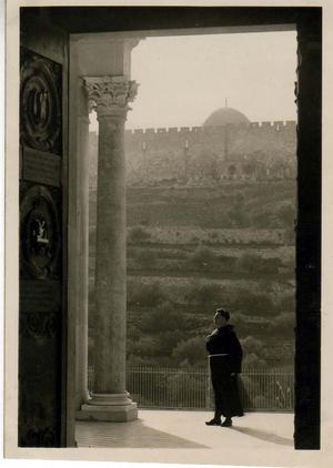 Looking from the door of the Church of All Nations onto Jerusalem old city wall with the Mosque of Omar visible. On leave in Palestine September 1943