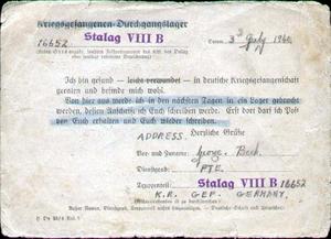 July 05, 1940 Registered as prisoner of war at Stalag VIII B. Forwarded first card home by Red Cross via Geneva. What a relief to write again. The card is shown above and is dated 3rd July 1940