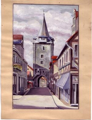 A painting of a German street scene, signed by a K, or H, or M Elkhardt; a gift presented after the war to Harold and Honor Blair of Winterbourne Gunner by one of the Wiltshire POWs