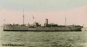 My last and only big ship was HMS Greenwich, a destroyer depot ship, in Portsmouth harbour. I was leading telegraphist to S.O.R.F. Portsmouth. My main task was to send out test signals to selected vessels in the reserve fleet and then be taken by picket boat to collect and mark them. This was a nice quiet number and a good way to finish my service.
