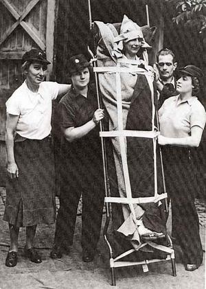 The photograph shows some of the Hitchin ARP team with the end result of a 'first aid' practice outside the Woodside Hall, in Hitchin, Hertfordshire. The 'injured party' looks comfortable enough! The man at the back on the right is Mr Bernard Brockett.