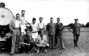 Army Camp Open Day 1938. Harry Brooks in physical training kit (squatting centre) and searchlight team. Note the uniform (on right) is still First World War pattern with ‘puttees’, canvas bindings from boots to knees. The searchlight is also First World War vintage.