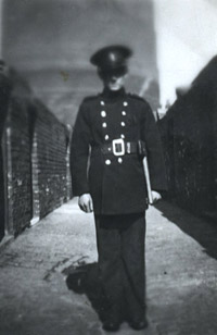 Fireman Fred standing in front of the Gas Storage Tank before it was bombed. Middlesbrough 1941