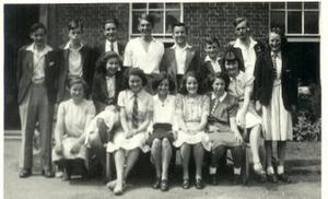Ledbury Grammar School, Herefordshire, in 1942-43. This was the whole of the Upper V year - 15 pupils! Kathleen Reece is sitting second from right. Others are Ruth Maddox, Bunty James, David Powell, Ray Carpenter and Whisky Walker.
