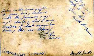 Caption and signatures on back of photo of Sergeant Ronald Budd (1/6th Queens Royal Regiment) and Harold Smith celebrating VJ Day 1945 in Venice.