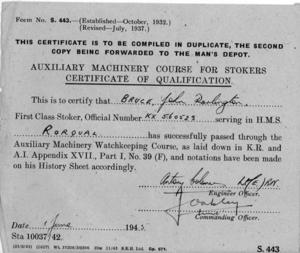 John Darlington Bruce’s Auxiliary Machinery Course for Stokers Certificate of Qualification.