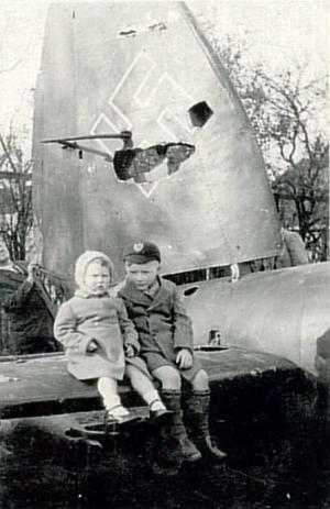 My sister Jean and I sitting on the tailplane of Heinkel 111. Picture taken 4th Nov. 1940, at Botwell Green Hayes Middx.