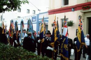 Sunday 26 June 2005: Standard Bearers from Royal British Legion Branches, Veterans and Service Associations waiting to take part in the official County of Cumbria 'Victory Parade' at Whitehaven, Cumbria. About 1000 WW2 veterans and 37 Standard Bearers took part. [Photograph by Joseph Ritson].