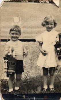 Alan Bateman with his older sister margaret holding the gas masks issued to them. Alan would probably be about 4 years old and Margaret about 6. It was taken around 1940.