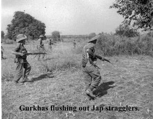 As a good view of the opposite bank could be obtained from there, the Sikhs had extended their flank to occupy it, and I went with the company commander, flat on our bellies for concealment, to watch for Japanese movement. While patiently pursuing this task, my hand idly picked an innocuous looking pepper; it was so "hot" I could hardly taste anything for days. What we did observe was not Japs' movement, but a bullock cart. That night, the Sikhs found enough country boats to send a strong fighting patrol across the Irrawaddy, manhandling one of the mountain guns onto the same bullock cart as we had seen. They dragged it to a suitable position and fired four rounds in the direction of the presumed Jap HQ. Then back to the shore and all safely across to our side of the river. Later, we heard from friendly sources that those Japanese had spent a sleepless night looking for the gun; of course without success.