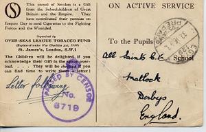 Gifts were sent to soldiers (Desert Rats) in North Africa from All Saints C of E School, Matlock and this postcard was sent back to the school to thank everyone.