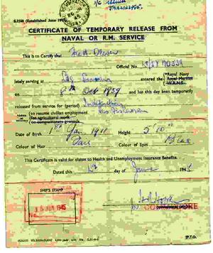 Discharge Paper releasing Frederick oliver to go back to Hulls fishing Fleet after a service period from 8th October 1939 - 15th June 1945