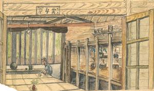 The camp as it looked at the time of capitulation. (15th August 1945 Japan official surrender) The number of men in the camp was 42. This picture was hand painted by Fred during his time as a POW on an island off Nagasaki — he made his own paint brush by using the hairs from a local dog, the corner of the painting was eaten by termites