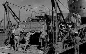 Army, Navy and Air Force give help with the loading of a lorry load of equipment about to depart from North Africa to Sicily.