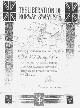 My sister’s husband would come and go, his leave permitting, but he was in Normandy during its liberation and a certificate was presented to him at the end of the war by the then King of Norway. The scroll is illustrated above. He never talked of the bad times in Europe, but would relate many a funny story about the period when he was involved in looking after German prisoners of war. He said that most of them were ordinary family men just wanting to locate families and hoping the war would soon end. He used to say that they were all thankful that the British Army had captured them, and not the Russians. Bill used to try to teach me German, which he picked up through associating with the prisoners.